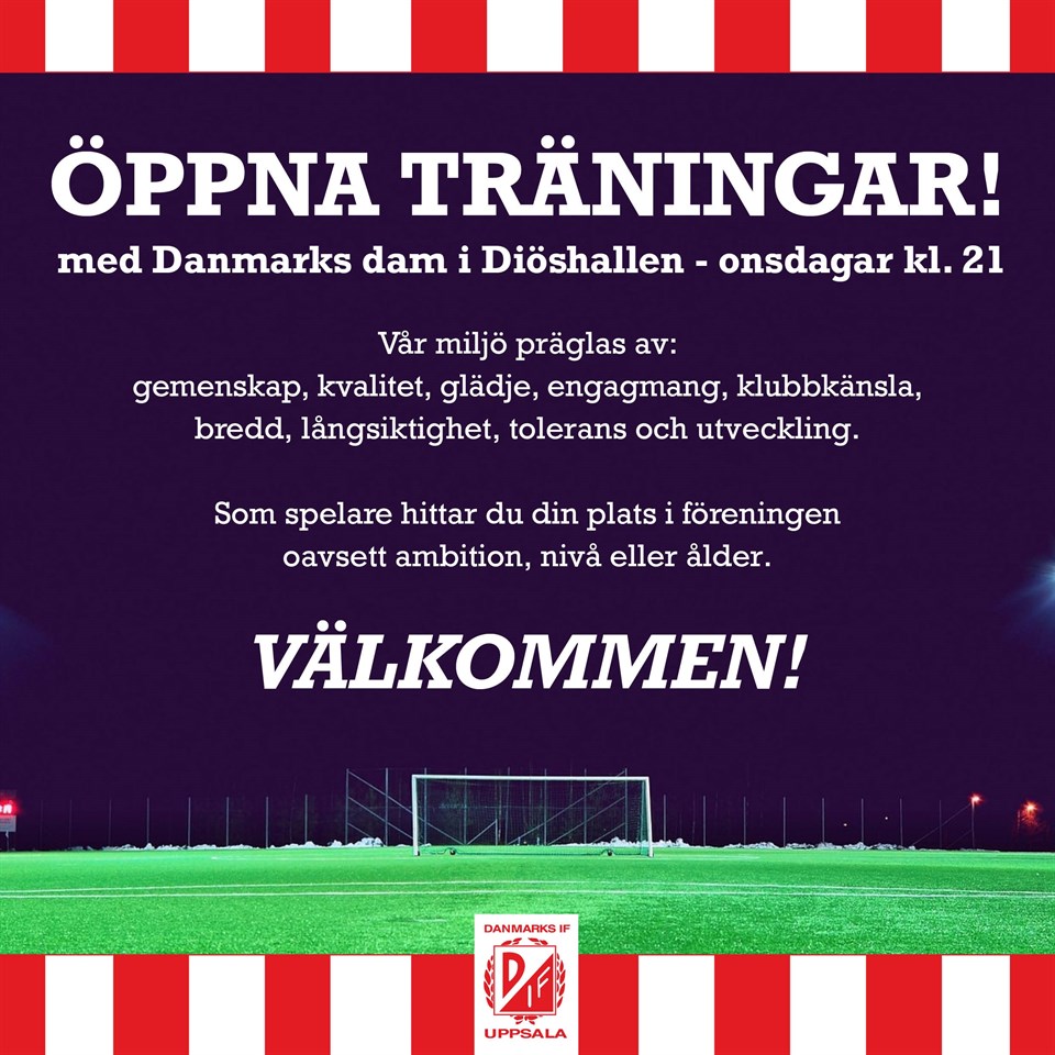 Nu är det fullt fokus på försäsongen 2022, och därmed även säsongen 2022. Vi är supertaggade på säsongen i år och hoppas att den blir lika framgångsrik som förra! Om du är intresserad av att komma och träna med oss i Danmarks Dam så kommer vi ha öppna träningar under försäsongen som du är varmt välkommen till. De öppna träningarna kommer vara i Diöshallen på onsdagar kl. 21.00. Om du är intresserad av att komma ner och träna med oss så kontaktar du vår tränare Magnus Dureman på telefonnummer 070-212 60 76. Tveka inte att ta kontakt med Magnus för att komma ner på en träning! Hoppas vi ses på en träning snart! :-)