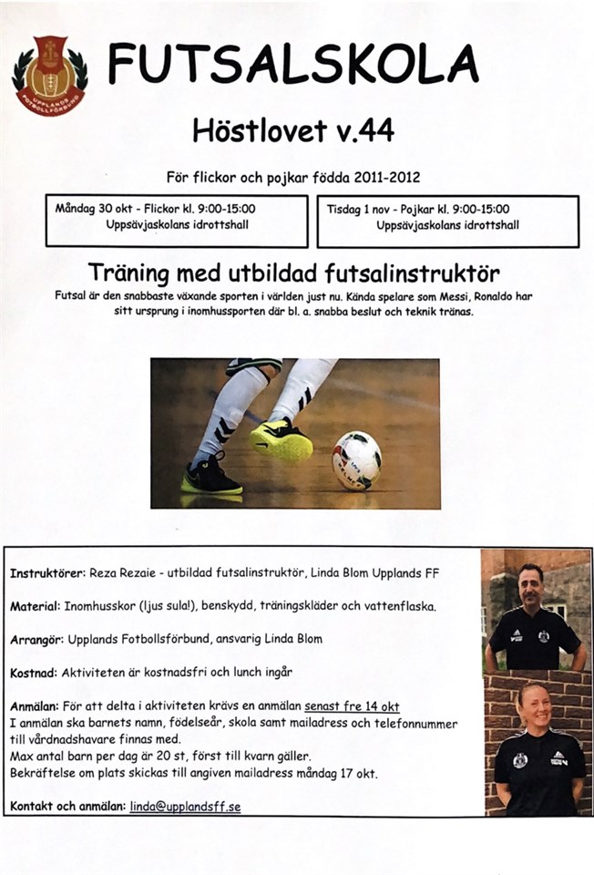 Under höstlovet anordnar Upplands Fotbollsförbund Futsalskola. För tjejer så är det måndagen den 30 oktober som gäller. Plats Uppsävjaskolan/idrottshall. Se bifogat dokument! Vänligen, Andreas