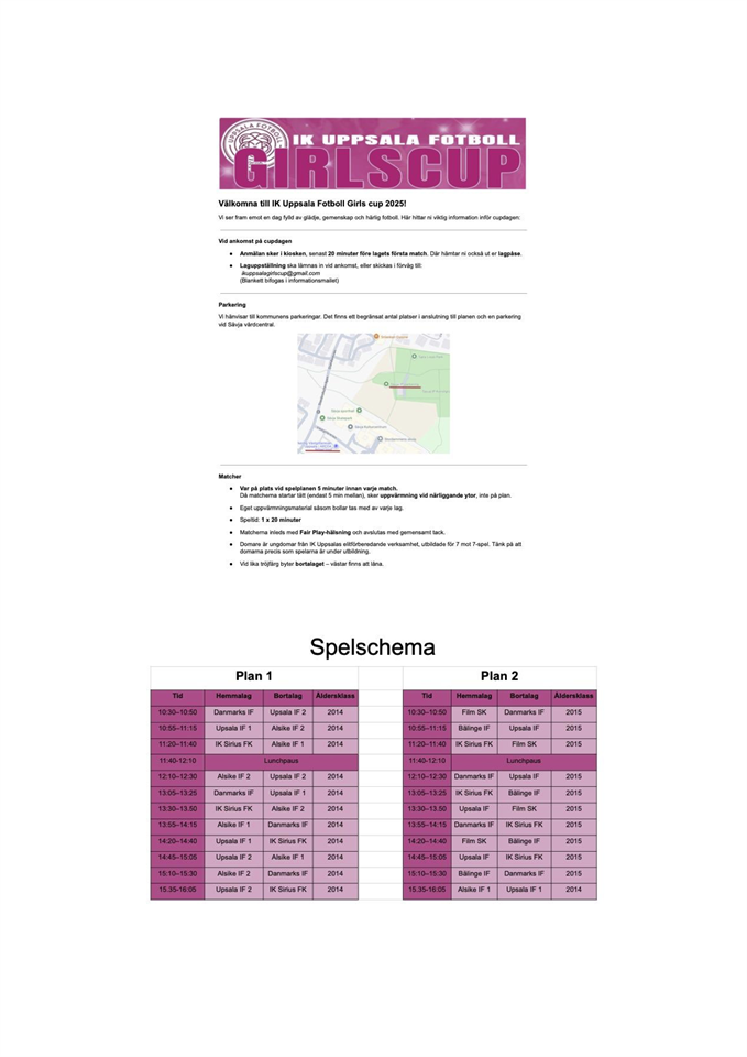 Bifogar allmän information om Girls Cup (även utskick i WA gruppen) Samling kl 10 ombytta och klara: Anmälda: Nellie Line Astrid Iris Vilma Viktoria Julie Meja Isabella Cornelia Mila My Tuva Saga Lilly Doris Då vi är 16 spelare kommer 3 aktiva få stå över/match. Det är fyra matcher så alla får spela minst 3 st. Om någon behöver komma senare (match 2 startar kl 12.10, samling 11.30) eller åka tidigare (match 3 slutar 14.15) så kommunicera nedan eller via WA gruppen. Annars tilldelar vi 3 st som vilar/match. Även som vilande spelare är det givetvis väldigt uppskattat att vara med som supporter sittandes med laget. Som det ser ut blir det som på förmiddagen och ev något regnstänk på eftermiddagen. Ta med keps och solkräm till tjejerna och överdrag efter väder. mvh Ledarna F2015 27 maj 2025 0kommentarer