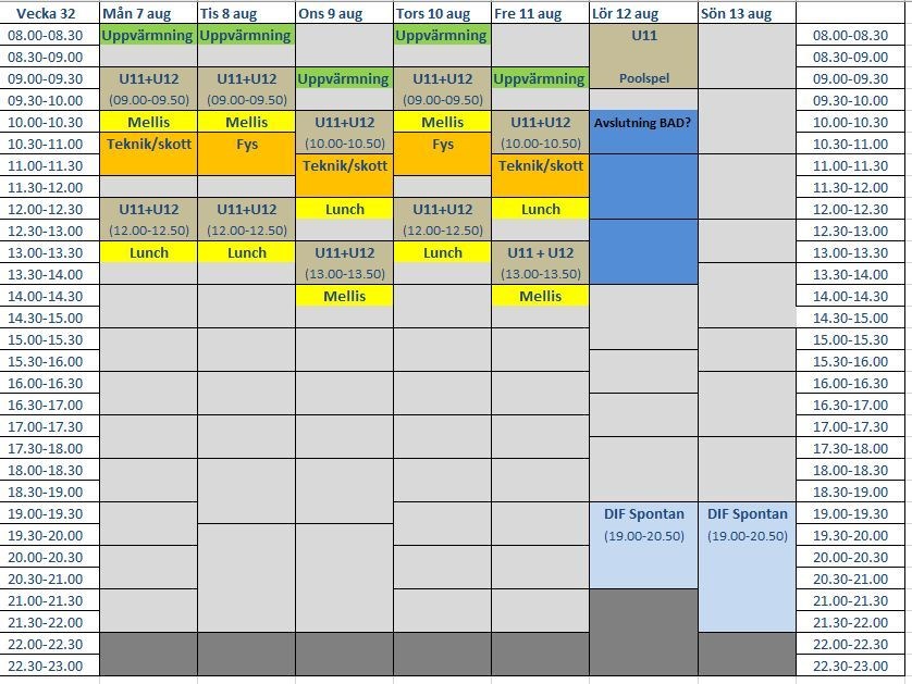 Hej! Hoppas ni har haft en fin sommar. Nu startar ny säsong och imorgon samlas nya lag U11 (😊) för uppstart. Här kommer lite info om veckan - inkl en fråga om lördagen: - Schema bifogas. Samlingstid är enligt kallelsen på laget.se dvs kl 8 månd, tisd och tors; kl 9 onsd och fred; samt kl 7 på lördag (poolspel). - Vi har omklädningsrum 7 alla dagar och kan förvara våra grejer där (tränare ansvarar för nyckeln). Mellan onsd och tors behöver vi dock förvara allt i 2:an eftersom ett gästande lag ska använda 7:an onsd kväll. - Lunch och mellis är beställt från caféet, som hämtas av laget/tränarna, som också bestämmer var maten ska intas. - På lördag morgon är det poolspel, troligtvis i tre matcher. Vi håller just på att bjuda in två lag, återkommer så snart vi vet vilka det blir. FRÅGA: har vi några frivilliga som vill sköta sekretariatet? - Bengt, Marcus och Kalle är våra ledare/tränare under veckan. Ispass körs med lag-12 och Bengt och deras huvudtränare Carl samordnar sig. Vid ev frågor är det som vanligt bara att höra av sig till tränarna eller lagledare. Med önskningar om en kul vecka!