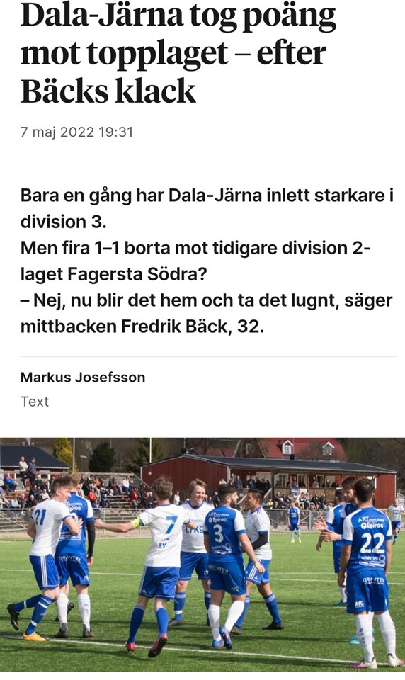 Matchen blev flyttad under denna Lördag till Norberg, Malmheden på konstgräs med avspark kl 14:00. Bussen rullar iväg och känslan av det kyliga vårvädret kan bli en spännande omgång 5. Hemmalaget Fagersta hade besegrat alla sina tre motståndare Sala, Rengsjö och senast Slätta inför dagens drabbning. Järna kommer med ett kryss från Västerfärnebomatchen. Trupp: Lars Heens Linus Backman Oskar Bergsman Joakim Andersson Fredrik Bäck Willie Westlund Filip Landegren Abdimajid Mohamed Ahmed Robert Hedman Sebastian Hellström Wilhelm Gustavsson Mattias Albinsson Simon Blom Fredrik Sixtensson Adrian Enrique Chilo Bortalaget D-J öppnar starkt och spelar en bra fotboll. Man kommer till inlägg där Jocke sätter pannan på och det är nätkänning men tyvärr var det offside. Vi fortsätter hålla boll och spela bra, hemmalaget backar hem djupt och byter lite platser. Verkar lite som de organiserar om sig? Man försöker sedan genom kontringar där Sebbe och Fredrik tillsammas med en lysande Wilhelm får ställas på kraftiga omställningar som vi löser gång på gång som ett lag. Fysiskt spel och det är farligheter på hörnor från båda lagen. Det blir rörigt i straffområdet och vi avvärjer in i det sista via Wilhelm. 0-0 in i halvtid. Sedan till andra halvleken kör vi på och vi gör också välförtjänt 0-1 genom också en till trasslad situation där Fredrik åter igen är framme och serverar Jocke som sätter första målet i matchen. Boston kommer in för Jocke efter ca timmen spelade. Sedan byts Willie och Backman också in. Ut går Abdi och Oskar. Vi tappar lite mark och samtidigt höjer sig motståndarna och sätter kvitteringen till 1-1. Mängder av farliigheter från hemmalaget där vi kan pusta ut rejält, de är en nick från nära håll som är extremt nära, och som går tätt,tätt över. Lars har skött sig galant i målet med härliga räddningar! Vi har sedan en chans där Filip slår in den från höger och Hedman får sånär nätkänning men bollen rensas undan precis framför målet och matchen slutar 1-1. Vi gör en av våra bästa matcher för säsongen, helt klart. Men, nöjd får man aldrig vara! Men vi fick beviset som var spelet under 60 minuter som var väldigt bra, och vi står upp mot en bra motståndare som har spelare från Argentina m.m Dessutom tre raka vinster med sig i bagaget. Härnäst väntar Forssa BK som kommer till Dala-Järna 14:e Maj kl 15:00 på Järna IP.