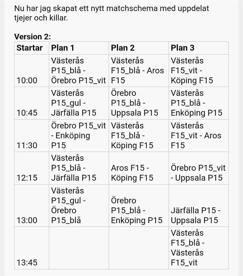 Nu spelar vi matcher klockan 10.45, 11.30 och 13.00.