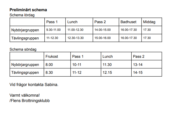 Hej! Helgen 11-12 februari ordnar Flens BK med stöd av Sörmlands brottningsförbund ett träningsläger för alla klubbar i Sörmland. Ett riktigt bra tillfälle att träna tillsammans med nya kompisar. Läs den bifogade inbjudan och anmäl deltagande i kommentarsfältet nedan. Kostnaden på 300 kr/deltagare står EGAK för! Välkomna till Brottarläger i Flen 11-12 Februari Träningspass Ett träningsläger för nybörjare (från 7 år och uppåt) och licensierade brottare. Både “nybörjargrupp” och “tävlingsgrupp” kommer att ha ett förmiddags- och eftermiddagspass på lördag och söndag med andra ord fyra pass totalt. På lördagen kommer Leo Östlund från BK Athen (utvecklingsansvarig för U17/U20 för förbundet) hålla i träningspassen och på söndagen håller Sabina Roglar och Dennis Magnusson i träningspassen. Kostnader 300 :- per deltagare, betalas på plats kontant eller via swish. Simhall Utöver träningarna kommer vi på lördagen ha ensam tillgång till simhallen mellan 16.00-17.30. Bra att veta: ? Man behöver eget hänglås till skåpen. ? Barn under 13 år får inte bada utan ansvarig vuxen (tre barn per vuxen), Flen ställer upp med föräldrar till brottare som inte har föräldrar på plats. ? För att vistas i simhallen ska man vara klädd i WCT (simkläder eller “träningskläder”) Logi + mat Vi kommer att sova i “gula längan” som ligger precis bredvid vår träningslokal. Det klassas som ett vandrarhem så ni behöver ha med er sängkläder. Det är även där ni kommer att äta alla era måltider. Anmälan Ni anmäler er till Sabina Roglar på 070-730 76 36. I anmälan ska det framgå: namn på brottaren, ålder, vikt, om den sover kvar samt eventuell specialkost. Sista anmälningsdag är fredagen 3/2. Samling Vi samlas i brottarlokalen vid Hammarvallen i Flen. Nybörjargruppen har sin första träning på lördagen kl 9.30 och tävlingsgruppen har sitt första pass kl 11.00.