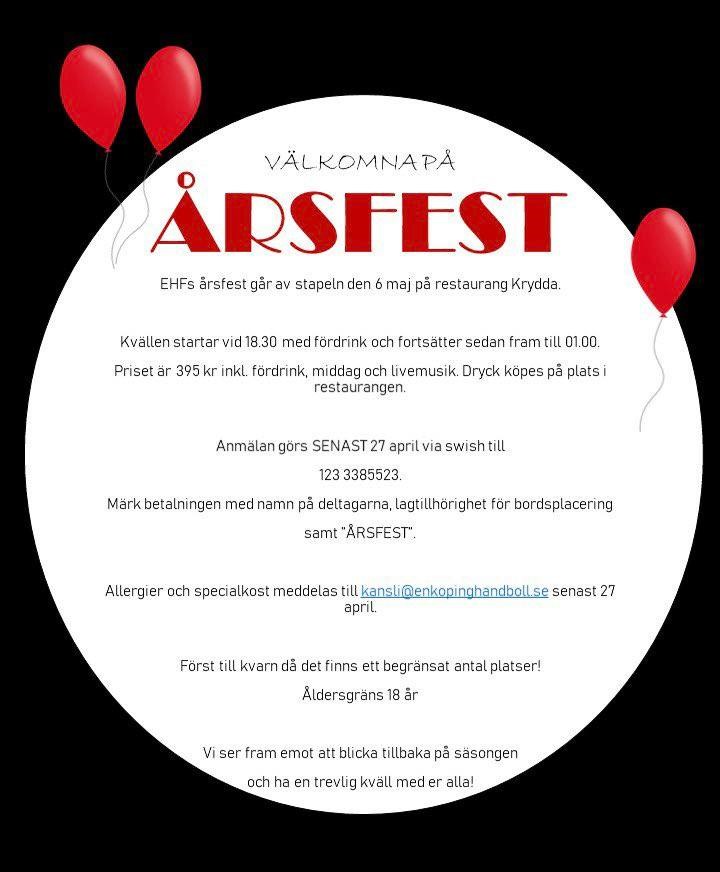 Hoppas vi ses på Krydda 6 maj! Man behöver inte vara medlem i EHF för att gå på festen, drag ihop lagets föräldrar och kom.