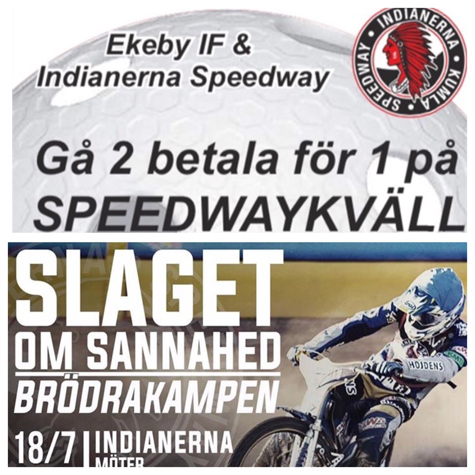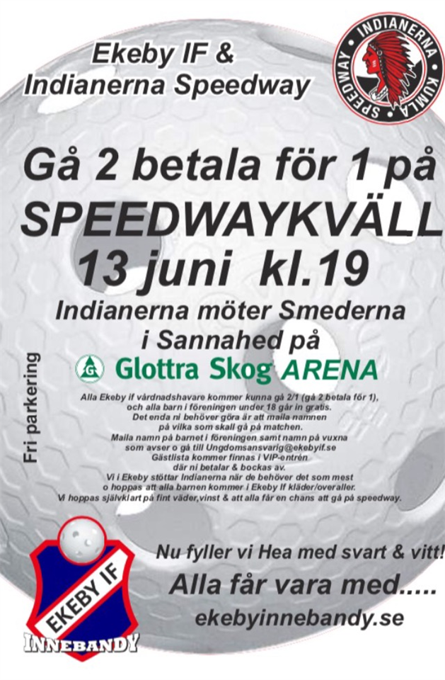 Alla Ekeby IFs vårdnadshavare kommer kunna gå 2 betala för 1 och alla barn i föreningen under 18 år går in gratis. Det enda ni behöver göra är att maila namnen på vilka som skall gå på matchen. Maila namn på barnet i föreningen samt namn på vuxna som avser att gå till Ungdomsansvarig@ekebyif.se Gästlista kommer finnas i VIP-entrén där ni betalar och bockas av. Vi i Ekeby stöttar Indianerna när de behöver det som mest och hoppas att alla barnen kommer i Ekeby IFs kläder/overaller. Vi hoppas självklart på fint väder, vinst och att alla får en chans att gå på speedway.