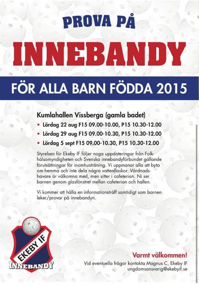 Nu startar Ekeby IF upp innebandy för P/F födda 2015. Kom ner och testa att lira, vi kommer att ha lite information för föräldrar., samtidigt som barnen provar på. Ledare på prova på tillfällena är från lagen F/P14. Vi behöver givetvis ha ledare/vuxna på planen. Är du intresserad och kan tänka dig att vara med? Meddela på plats, inga förkunskaper krävs. Vi utbildar alla som vill vara ledare. Vi följer FHM rekommendationer, och rekommenderar alla att byta om hemma, medtag vattenflaska. Klubbor finns att låna. Ta gärna med glasögon om ni har. Hoppas vi ses där!