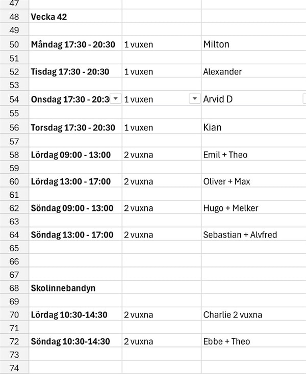 Här kommer en sammanställning på hur schemat för kafét i Kumlahallen under kommande vecka (V.42) ser ut samt schemat för skolinnebandyn 25-26 oktober.