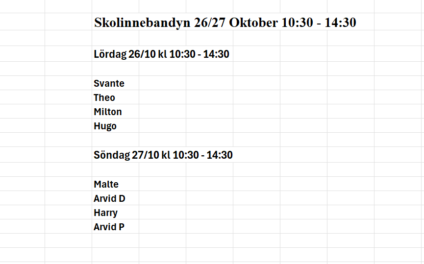 Hej! Nu har vi lite mer info om kommande pass där vi behöver täcka upp cafeterian för säsongen 24/25 Nu är det mer övergripande info, mer planering kommer att komma närmare. Till en början behövs det föräldrar till skolinnebandyn som är den 26-27 oktober. Här behövs det 4 vuxna respektive dag, 10:30 - 14:30 är tiden. Vi tre i föräldragruppen kommer ta ett pass var, så då är det 5 vuxna till vi behöver. Nästa period kommer att vara poolspelsfesten 23/24 november, detta som en del av er vad med på förra året. Här kommer det vara P-17/ F-17 samt P-18/F-18 som har det övergripande ansvaret. Så här får vi räkna med att många av oss kommer behöva vara med, vet dock inte antalet ännu. Det finns en arbetsgrupp som är ansvariga och kommer skicka info till oss med hur många vuxna vi ska bemanna med. Vecka 1 ska vi bemanna cafeterian, precis på samma sätt vi gjorde under vecka 37. Tillsist är det företagsinnebandyn den 5 April, där vi behöver bemanna med 4 vuxna. Såhär ser alltså året ut och mer info kommer att komma innan varje evenemang. ( I god tid dessa gånger) Som tidigare skrivit så blir det i första hand de som inte tidigare stått som blir ombedda att stå, finns det frivilliga redan nu så säg till. Återkom gärna vid frågor eller funderingar, som sagt så kommer mer info! Ta hand om er. Med vänlig hälsning, Föräldragruppen!
