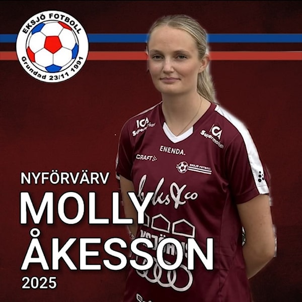 Nu hälsar vi damlagets nyförvärv Molly Åkesson hjärtligt välkommen till IF Eksjö Fotboll. Molly har Södra Sandby IF som moderklubb (med spel i division 2) men kommer nu senast från Kristianstad DFFs F19-lag i Allsvenskan. Molly trivs bäst som ”kantspringare”, både i försvaret och på mittfältet och hon kommer med all säkerhet att bli mycket nyttig och bidra med spets i vårt Dam-lag.