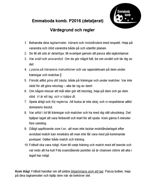 Hej! Här kan ni läsa lagets regler och värdegrund, dvs hur vi vill ha det på träningar, matcher mot varandra osv. Detta har vi ledare bestämt i samråd med spelarna som har fått vara med och diskutera. Den är ganska detaljerad men läs den tillsammans med era barn så att både ni och dem vet vad som förväntas. Inför varje poolspel så kommer vi ha en lite enklare värdegrund med oss, likt de tre reglarna vi har under träningarna. Allt för att skapa en tydlighet för spelare, ledare och föräldrar. D P-16 22 apr 2025 0kommentarer