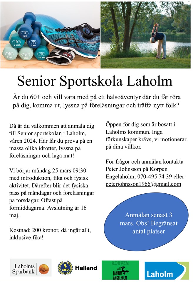 Kul och ny aktivitet i Korpen och först med Sportskola i Halland. 25 mars-16 maj. Vi kommer att prova olika idrotter och lite nya aktiviteter som ligger utanför idrotten med. Vi kommer att ha måndag som "sportdag" och vi samlas alltid vid Laholms Vandrarhem. Start på måndagar är kl.9.30 och fika måste vi ha efter aktiviteten. Förutom 2 april som är tisdag. Annandag påsk måndag röd dag. Vi kommer och ha föreläsningar om allt mellan himmel och jord! Föreläsningar har vi planerat till: Torsdagar 4 april, 11 april, 18 april, 25 april, 2 maj (kväll) och avslutning 16 maj hos Laholms Sparbank med föreläsning och fika. Annars alltid med start kl.9.30 från Laholms Vandrarhem. Allt är preliminärt och kan ändras under tiden. Vi hoppas att många vill anmäla sig till Sportskolan 60+ Vi har satt Max: 16 deltagare till Sportskolan och vi vill ha in åtta män och åtta kvinnor till Sportskolan. Anmälningsavgiften är 200:- för allt. Anmälan till: Peter Johnsson 070-4957439 eller Mail: peterjohnsson1966@gmail.com Vi tar imot anmälan till 3 mars. Vi kommer att ta ut deltagare efter anmälan och skicka till er om ni blivit uttagen. Lite spänning till slut: programmet i sin helhet kommer ni få den 25 mars när vi startar. Det går bra att anmäla sig nu. Ses 25 mars. Samarbetspartner är Laholms Sparbank och SISU Halland Mvh Korpen Engelaholm