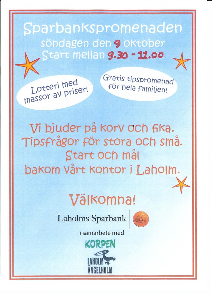 Gratis vuxen/barnfrågor/korpjakt..Startid:9.30-11.00 med start och mål bakom Laholms Sparbank. Gratis korv m bröd och fika till dom som går tipspromenaden och roliga lekar m m. Kan vi slå 302 startande från 2013 ? Välkomna! Samarbetspartner Laholms Sparbank och Korpen Engelaholm