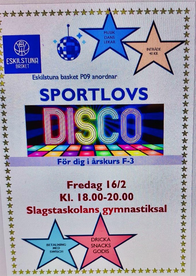 Disco 18:00 - 20:00 Slagstaskolans matsal nu på fredag 16 februari Välkomna Eskilstuna Basket 15 feb 2024 2kommentarer