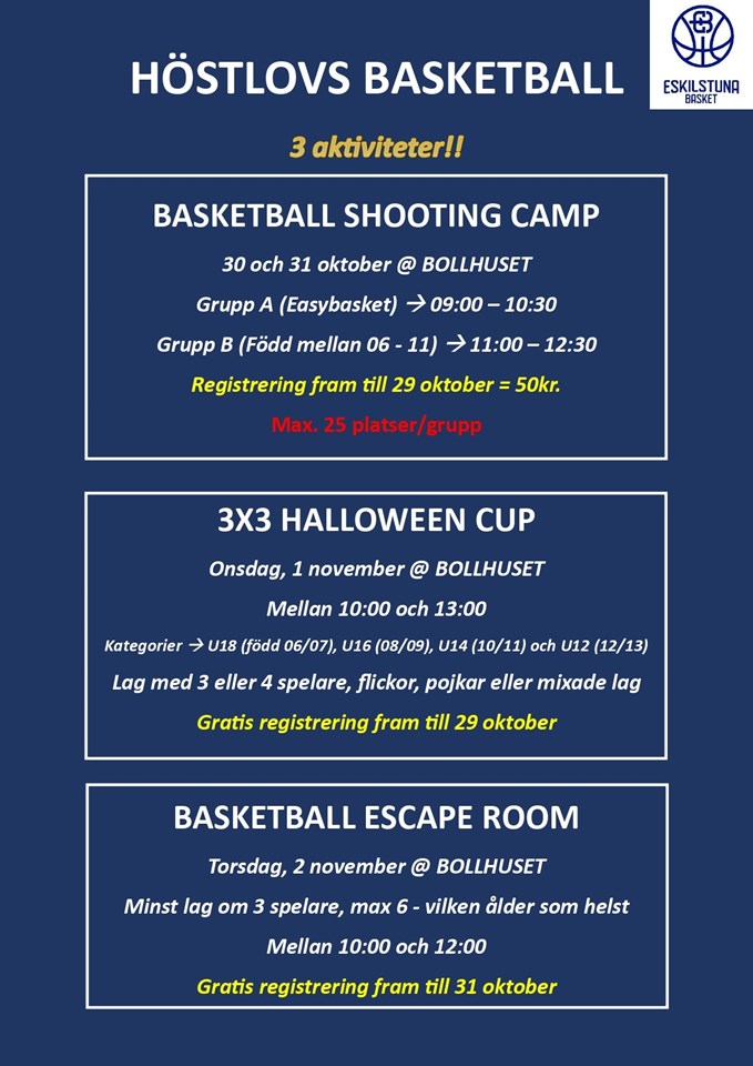 BASKETBALL SHOOTING CAMP 30 och 31 oktober @ BOLLHUSET Grupp A (Easybasket) ? 09:00 – 10:30 Grupp B (Född mellan 06 - 11) ? 11:00 – 12:30 Registrering fram till 29 oktober = 50kr. Swish 123-480 51 23 Max. 25 platser/grupp https://docs.google.com/forms/d/e/1FAIpQLScshJu7h1BS_P1clxdr1ywVaoQ6OJClrRYHJyXoSvRMiPJFbw/viewform?usp=sf_link 3X3 HALLOWEEN CUP Onsdag, 1 november @ BOLLHUSET Mellan 10:00 och 13:00 Kategorier ? U18 (född 06/07), U16 (08/09), U14 (10/11) och U12 (12/13) Lag med 3 eller 4 spelare, flickor, pojkar eller mixade lag Gratis registrering fram till 29 oktober https://docs.google.com/forms/d/e/1FAIpQLSdVwG6iO_L2d4De17yQQvfWmweLi5CR9UNZEJiNLxlIZvT_cw/viewform?usp=sf_link BASKETBALL ESCAPE ROOM Torsdag, 2 november @ BOLLHUSET Minst lag om 3 spelare, max 6 - vilken ålder som helst Mellan 10:00 och 12:00 https://docs.google.com/forms/d/e/1FAIpQLSc3bcqEfv_XNUufFAmBuTT1LuzjmuzXg8Z1jioIyJP4YWLfBg/viewform?usp=sf_link Gratis registrering fram till 31 oktober