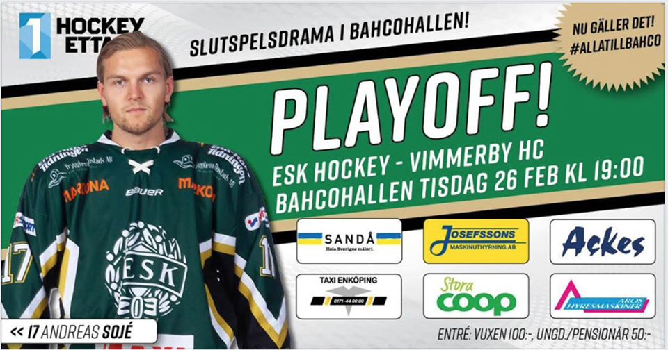Då har det blivit klart med vilka som ESK får möta i Play Off 1. Det blir Vimmerby som kommer till Bahcohallen på tisdag. Kul med en motståndare vi inte har mött på länge. /Lasse