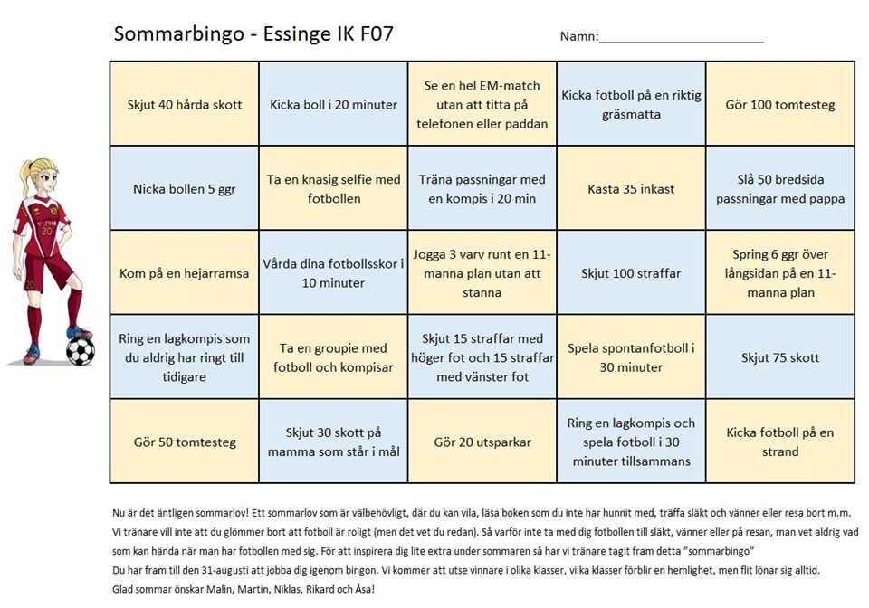 För att inspirera till lite fotbollsaktiviteter i sommar delade vi ledare igår ut ett sommarbingo till tjejerna så att de inte glömmer bort fotbollen under sommarlovet. Så varför inte ta med fotbollen i sommar till släkt, vänner, till stranden eller på resan? Man vet aldrig vad som kan hända när man har fotbolllen med sig:-) När det gäller bingorutorna som handlar om att ta selfies och groupies så får ni gärna maila era bilder till Åsa på asa.magander@gmail.com så publicerar hon dem i en särskild sommarbingo map på laget.se så att alla ska kunna ta del av varandras bilder. För de tjejer som har mobiltelefon så får ni gärna ner appen "laget.se" till deras telefoner också så kan de själva smidigt gå in och se varandras bilder samt hitta varandras telefonnummer som de kommer behöva för att lösa bingot. Vi hoppas att detta bingo kan inspirera till många roliga stunder med bollen. Tjejerna har fram till den 31 augusti på sig att jobba igenom fotbolls-bingot. Vi kommer att utse vinnare i lite olika klasser, vilka klasser förblir en hemlighet, men flit lönar sig alltid:) Glad sommar önskar Malin, Martin, Niklas, Rikard och Åsa