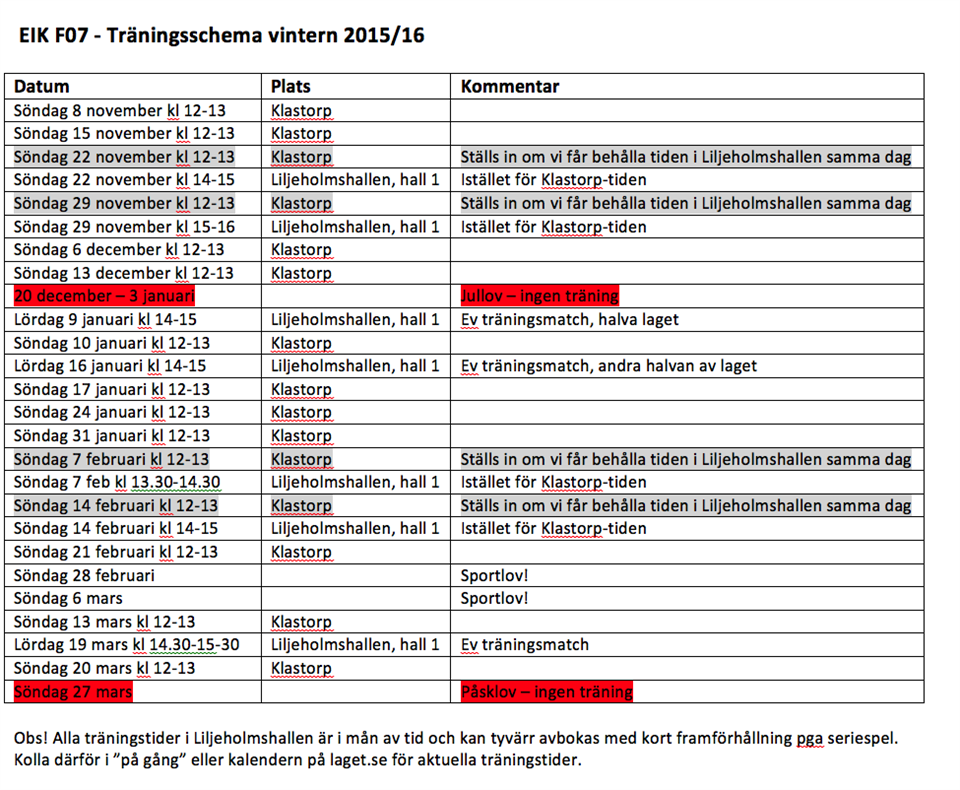 Vill påminna er alla om att titta på laget.se/essingeikf07 under "på gång" för aktuell information om tid och plats för vinterns träningar. Ännu smidigare tycker i alla fall jag att det är att ladda ner appen "laget.se" där man tydligt ser alla träningar och kallelser under "aktiviteter". För er som har flera barn i klubben så får ni dessutom en bra översikt för alla era barns fotbollträningar och matcher. Bifogar filen med det preliminära träningsschemat som gick ut till alla 20 oktober igen så att ni kan boka in tiderna i almanackan. Men eftersom vi fortfarande har dubbla bokningar för träning vissa söndagar (både i Klastop och Liljeholmshallen) så ber jag er att alltid på laget.se för aktuell info om vilken tid och plats det är som gäller. Om någon har problem med inloggningsuppgifter till laget.se är det bara att maila mig på asa.magander@gmail.com så löser vi det:) /Åsa