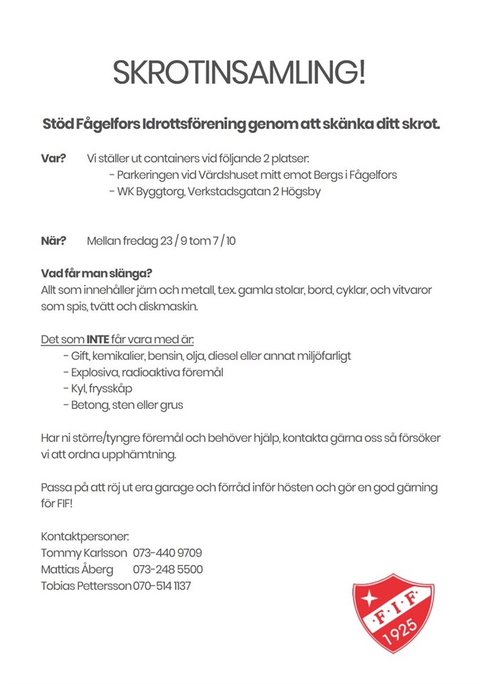 Ingen vinnare V.36 Nästa vecka kör vi igen och ni lämnar in era kuponger hos Johannas Blommor. Vid frågor kontakta Pär Lönn Eller Tommy King. Tack för att ni stödjer oss i Fågelfors IF Div 5 NÖ Herr 13 sep 2022 0kommentarer