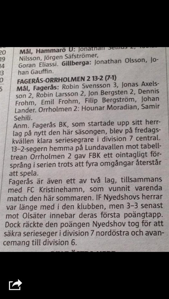 Fyra matcher återstår av säsongen 2014. Men en fantastisk säsong – med tolv raka segrar – innebär att Fagerås BK redan nu är klara seriesegrare i division 7 central. Det var en sån där match. 1–0 i första anfallet. 2–0 innan fem minuter var spelade. 7–1 i halvtid vilket blev till 13–2 efter 90 minuter. Och en flaska skumpa med texten "Seriesegrare 2014" i medicinväskan hela tiden. Matchen behöver ingen särskild analys mer än så. Vinner man mot tabelltrean med elva måls marginal, i en match där en pinne behövdes för att säkra seriesegern, är man helt enkelt ett tveklöst värdig vinnare. Och vinner man tolv matcher i rad, har 65–18 i målskillnad och en serieledning på 16 (!) poäng är man helt enkelt en tveklöst värdig seriesegrare. Nyedshov hann visserligen före, men de har bara tre matcher kvar och säkrade dessutom seriesegern genom att för första gången den här säsongen (3–3 mot Olsäter) tappa poäng. För Fagerås och FC Kristinehamn, som ännu inte säkrat sin serieseger, finns fortfarande chansen att gå genom en hel säsong utan ett enda poängtapp. Att seriesegern skulle säkras har varit klart ett tag, frågan var när snarare än om. Men ett stort mål finns kvar – att gå genom hela säsongen utan poängtapp. En än större bedrift och något att ha som målsättning. Kvällens… …viktigaste #1: 1–0-målet som satte ton för hela kvällen. …vackraste: Bland många vackra mål, och många vackra avslut, sticker Robin Larssons första och Filip Bergströms enda ut lite extra. …citat: "Passa…. PASSA" – Dennis Frohm visar den allra vackraste av kärlek – brödrakärlek – till Emil när han kommer fri och har chansen att utjämna Frohm-brödernas skyttekamp. …partyfirare: "Perry" – alltid med när det händer. En legender. …prestation: Nummer 17 i Orrholmen, Ibrahim Juboori, som tog en 50 meterslöpning hemåt och liggande raklång i luften nickade bort ett till synes klart Fageråsmål. …viktigaste #2: Att Fageråselvan i första halvlek vann "sin" match med 7–1. …viktigaste #3: Att Fageråselvan i andra halvlek bara vann sin match med 6–1. …betongkloss: Jon Bergsten eftersom det är så motståndarna upplever honom och eftersom det är just betongsäker som hans plats på innermittfältet lär vara efter de två senaste matcherna. …tränare: Eric ”Swanis” Swanström – vann coachkampen överlägset. …hjälte: Clas Glan Rohm. Vem, tänker ni? Jo, Orrholmsmålvakten som ställde upp när ingen annan ville och såg till att det blev match. Gjorde dessutom en utläcker parad på Jonas Axelssons tåfjuttkanon.