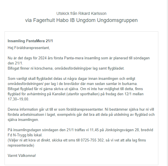 Klicka på bekräftelselänken i det mejl vi skickat dig för att börja ta emot uppdateringar från Fagerhult Habo IB Ungdom P-11.