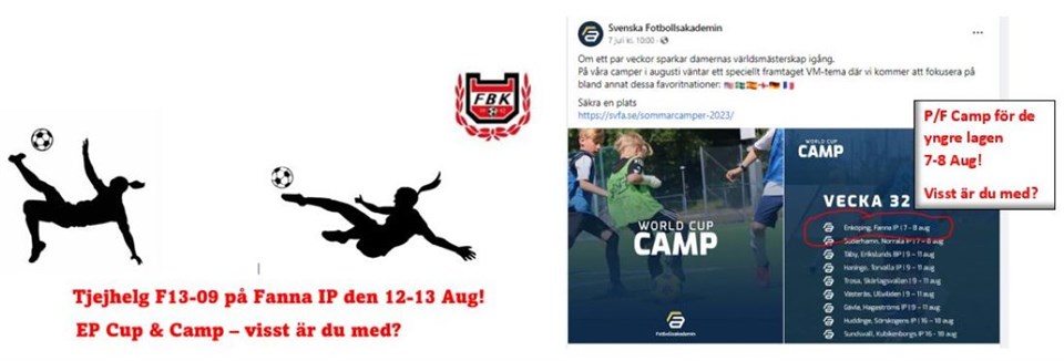 Hej Hoppas alla har en härlig sommar. Här i Fanna BK händer det saker hela tiden, oavsett sommar och s k lågsäsong. Vi är i full gång med allt som skall sättas på plats inför uppstarten i augusti. Jag tänker bara nämna några av dom här där ni berörs olika mycket. Alla goda ting är tre... 1. Pojk- och flickcamp 7-8 augusti för ålder 2012-2015. En återkommande camp i Fanna, i regi av Svenska Fotbollsakademin. Sommarcamp med VM-prägel! Energifylld, inspirerande och lärorik träning under ledning av Svenska Fotbollsakademin. I sommar spelas VM för damer i Australien och Nya Zeeland. Campen utgår från mästerskapets allra främsta lag och och vi tränar på på deras styrkor i spelet och signifikanta skills från deras största stjärnor. : Anmälan: 2. Tjejhelg 12-13 augusti på Fanna IP, där det blir både Cup och Camp. 12e augusti har vi dels EP cupen för flickor på Fanna IP och dels en tjejcamp där en av våra trogna sponsorer SH Bygg stöttar oss i att arrangera en väldigt bra camp. Campen pågår hela helgen 12-13 augusti och vänder sig till Flickor 09-13 (vi har blandade årskullar i vissa lagenheter och självklart är alla i lagenheterna välkomna) Hur dagarna ser ut har varje lagenhet fått info kring så vänd er till dom ledarna så får ni kompletta programmet. Frukost och lunch bjuds det på. Campen leds av delar från vårt fantastiska damlag som delar med sig av sina erfarenheter och kunskap, i olika övningar och sammanhang här. In och anmäl er så snart ni kan så vi har så många tjejer som möjligt på plats. Det stärker gemenskapen och möjliggör till en kul och givande helg. Anmälan: kansli@fannabk.se Vi knyter ihop detta med den tredje nyheten: 3. Nu har vi installerat ett högtalarsystem på Fanna IP. Speakerbåset har fått ett mixerbord och en mic och vi har högtalare riktade mot alla planer. Nu har vi ännu bättre förutsättningar att få den rätta stämningen vid såväl matcher som sammandrag och cuper. Tack Ola Bigelius som hjälpt oss i detta på bästa möjliga sätt, (bl a så att föreningen kan ha en kontrollerad och begränsad kostandsmassa i detta, som vi alltid behöver ha i åtanke). Är du sugen på att bli vår speakerröst så varmt välkommen att höra av dej. Vet att det finns potentiella "röster" i några av våra lagenheter. 😊 Ha en fortsatt fin sommar. Njut och ladda batterierna. Varma hälsningar Jeanette