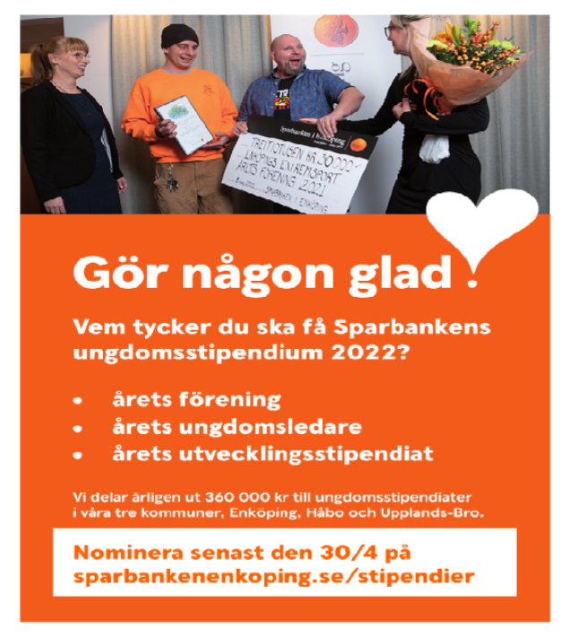 Nominera dina superhjältar Varje år delar vi ut 360.000 kronor till årets ungdomledare, ungdomsförening och utvecklingsstipendiat i Enköpings kommun. Sista ansökningsdag är 30 april. Nominera årets förening: Känner du till en bra ungdomsförening som är värd en extra slant i kassan? Då tycker vi att du ska nominera den till vårt föreningsstipendium för 2022. Länk till formuläret Nominera årets ungdomsledare: Känner du till en duktig ungdomsledare som är värd att hylla med lite extra uppskattning? Då tycker vi att du ska nominera hen till vårt ungdomsledarstipendium för 2022. Länk till formuläret Nominera årets utvecklingsstipendiat: Känner du till en ungdom som vill bli bäst? Där målet är att tillhöra en toppnivå inom sitt område? Då tycker vi att du ska nominera till vårt utvecklingsstipendium 2022. Länk till formulär Mvh Styrelsen