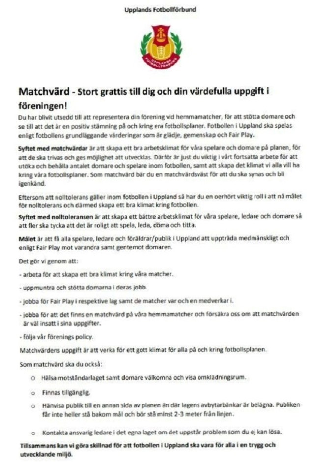 Hej Nu är det full fart på Fanna IP och mer väntar. A plan har öppnat, äntligen. DM för F06 har spelats och det gick strålande. Grymt jobbat. Imorgon drar Fotbollsskolan med ett stort gäng av fotbollssugna förväntansfulla barn igång. Till helgen har vi inte mindre än 13 hemmamatcher att se fram emot på Fanna IP. Vilket tryck och vilken glädje. Kiosken är också i full gång och har säkrat upp för helgen. Det finns mycket att tänka på när vi nu är igång, en viktig del kring matchspel som jag nu påminner alla om är rollen som matchvärd. Detta gäller alla våra lag från knatteligan till seniorlag. Det har varit lite otydligt kring kravet men i o m Nolltoleransen (som beskrivs i tävlingsföreskrifterna för alla åldersklasser, så SKA arrangerade förening tillhandahålla matchvärdar. Innan 2021 stod det bör, men nu står det ska. Från nu ska vi föredömligt följa detta på Fanna IP, och varje lag skall förslagsvis via sin lagledare/support se till att vi lever upp till detta på varje hemmamatch. Självlart också förvänta oss detta när vi besöker andra föreningar, men det kan vi inte styra över, på Fanna kan vi det. Jag bifogar UFFs beskrivning av vad en matchvärds uppgifter består av. Detta kommer naturligt att skilja sig i praktiken mellan en matchvärd för knattelag och en matchvärd ju högre upp i ålder vi kommer i lagenheterna. Jag har nu hängt upp gula matchvärd/funktionsvästar i kapprummet i klubblokalen, så det är bara att ta en eller två där vid nästa hemmamatch. Häng tillbaka dom efteråt tack. Nu önskar jag samtliga våra lag varmt lycka till i sina matcher i helgen, och välkomnar Fotbollsskolan! Jag hoppas få se många av er och andra fotbollsentusiaster på Fanna IP i helgen, och en och annan gul väst :-) Ha det gott //Jeanette