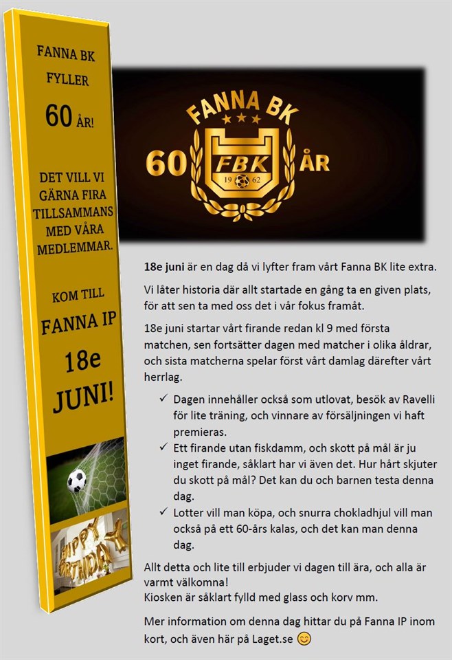 Hej Visst vet ni om att Fanna BK fyller 60 år i år? Från nu och framåt skall vi lyfta fram det i olika former och sammanhang. Inte minst den 18 juni när vi har vi en heldag på Fanna IP fullt med matcher och andra roligheter för små och stora. Alla är varmt välkomna. Mer om den dagens tillställning finner ni i bifogat blad, och ytterligare information kommer inom kort att gå ut bland lagen. Hoppas vi ses den 18e juni! Hälsningar styrelsen
