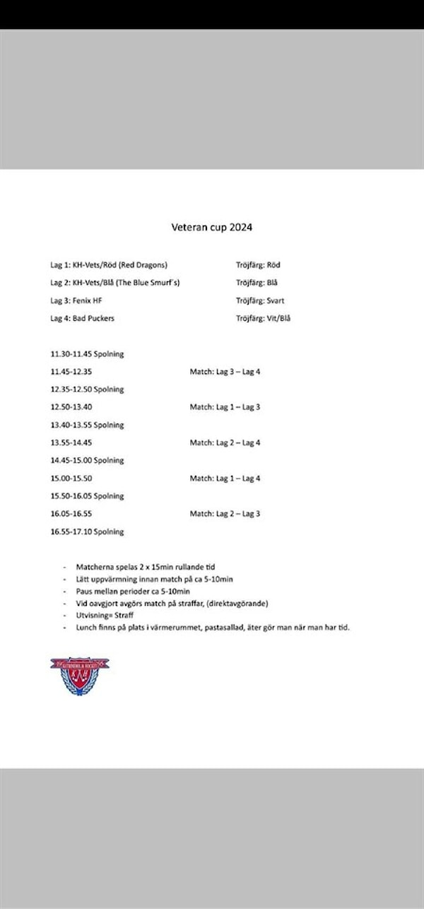 Uppdaterat spelschema. Vi börjar med match 11:45 och sedan 12:50 och avslutar med match 16:05. Så det passar nog bäst med lunch vid 14