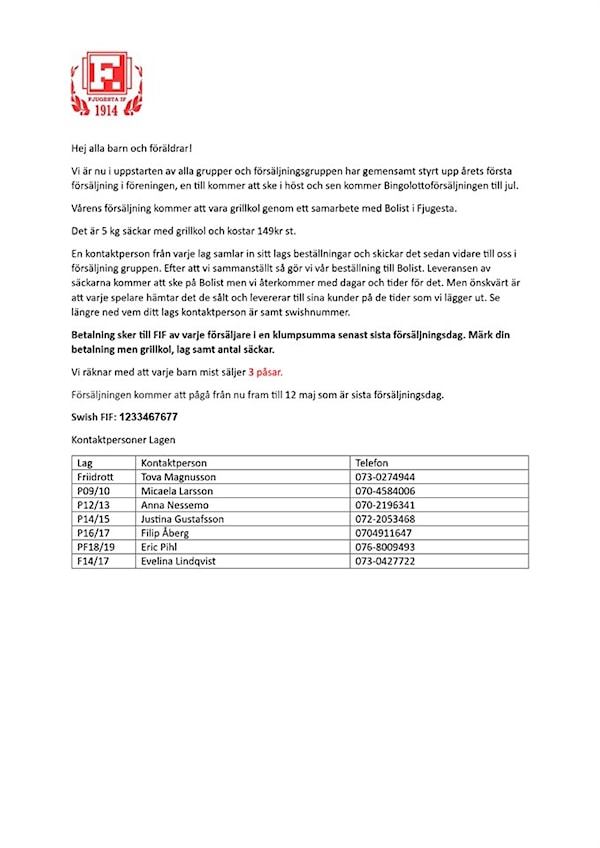 Nu har det gått några veckor och försäljningsgruppen inom Fjugesta IF har tagit fram årets första försäljning, grillkol, i samarbete med Bolist i Fjugesta. Tanken är att överskottet från försäljningen ska gå in direkt på friidrottens konto, och därmed möjliggöra att vi kan åka på fler tävlingar, investera i nya träningskläder - eller varför inte nya redskap till friidrotten? Vi väljer själva var pengarna ska gå.