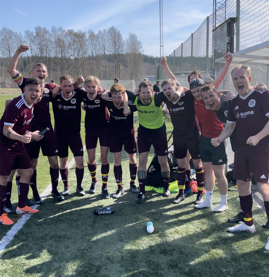 Efter två raka förluster åker de revansch sugna vinröda, med bra träningssessioner i ryggen ut till Härryda utanför Landvetter för sin andra bortamatch och på jakt efter säsongens första trepoängare. Härryda kommer med en klar seger ifrån deras förra match där de vann med 2-7 borta emot Johannebergs IF. Så på förhand såg det ut att bli en tuff match för Fröjdens emot ett målsprutande motstånd. Känslan i omklädningsrummet inför matchen är fokuserad, inget annat än trepoäng idag är ett alternativ. Coach Frazze håller i vanlig ordning i taktiksnacket, vi bestämmer oss denna matchen för att köra en hög och intensiv press, då det visade på resultat i föregående match, trots att man kan bli sårbar för kontringar och djupledsbollar. De vinrödas laguppställning: Oscar Andreas - Adam - Mackan - Thomas Calle - Victor Adam - Frazze - Mange Lucas Bänk: Hansson Gustav Emil Innan matchen skulle sättas igång på ett vindstilla och kokande Härrydas IP (19° i april!?) värmer de vinröda upp och man känner direkt att hela laget är spelsugna! Domaren sätter sedan pipan i mun och blåser igång första halvleken, Fröjdens tar direkt tag i taktpinnen och dominerar ifrån första minuten. Med fina spelkombinationer hittade man igenom Härrydas försvar flertalet gånger som resulterade i vassa målchanser för både Mange, Victor och Frazze. Men tyvärr så lyckades man ej hitta nätet med dessa chanserna. Men det ledde fram till ett flertal hörnor, där Härrydas målvakt gör ett par fina räddningar. Trots Fröjdens dominanta spel och målchanser är det hemmalaget som tar ledningen på en omställning på en Fröjdens hörna. Oscar hamnar i en chanslös två mot en situation och 1 - 0 är ett faktum efter 18 spelade minuter. Efter underläges målet blir spelet ifrån Fröjdens lite knackigare, lättare bolltapp och mindre chanser framåt. Men fortsatt dominant och kontrollerat utav de vinröda. I slutet utav den första halvleken fick Lucas bollen i motståndarnas straffområde och lurade två motståndare upp på läktaren för att köpa korv (i vanlig ordning!). Men precis innan han skulle tråckla sig förbi för att näta så blir han sparkad och tappar balansen, men faller inte till marken. Så motståndarna hann först till bollen och kunde rensa iväg den. Vi går in i andrahalvlek i underläge, men spelplanen är oförändrad. Övertygade att om vi fortsätter på samma spår som vi gjorde i första halvlek så skulle det ge utdelning. Vilket det gjorde! I den 67:de matchminuten får Lucas återigen bollen i motståndarnas straffområde och bjuder på fina finter innan han blir sparkad igen. Men denna gången så lägger han sig, lite i Bruno Fernandez style vilket ger straff till Fröjdens! Lucas lägger själv bollen på straffpunkten och placerar den säkert i målvaktens högra hörn, 1-1! Detta målet gav de vinröda nytt vind i seglet och man fortsatte trampa på för ett ledningsmål, vilket skulle komma in den 70:de minuten. Adam lägger en djupledsboll (eller rensning?) ifrån sin mittbacks position som hittar bakom motståndarnas backlinje som inbytte Gustav löpte på. Härrydas målvakt är först på bollen, men Gustav lyckas att störa målvakten så pass mycket att han rensar bollen rakt på Gustav så den reflekteras över målvakten. Gustav tar kyligt ner bollen och rullar in den i öppen kasse, 1 -2!! Trots ledningsmålet varade inte lyckan länge, för i den 74:de minuten tappar Fröjdens bollen i ett farligt läge på mittplanen. Härryda hittar in med en fin långboll mellan ytterback och mittback. Detta gör att Oscar springer ut och ska rensa bollen, men Härrydas kvicke anfallare lyckas peta bollen runt Oscar som istället klipper anfallaren så att det ekar ända bort till Landvetter flygplats. Ett rött kort delas ut till Oscar, ett kort som kan diskuteras ifall det ska vara rött eller inte. För vår ytterback tycks vara närmst målet och Härryda spelaren skulle då inte ha friläge. Tur i oturen så blir det ”bara” frispark utanför straffområdet och ingen straffspark. Mange fick sadla om till målvakt för att försöka rädda frisparken, vilket han gör!! Efter det röda kortet ändrades matchbilden och Fröjdens fokus var nu endast att försvara Mange i målet för att kunna hålla kvar i ledningen. Härryda fick några få chanser, men inga chanser som skapade någon större oreda i försvaret. En riktig kämpar insatts utav de vinröda som lyckas bevara ledningen till domaren sätter pipan mun för sista gången i matchen och säsongens första trepoängare var säkrad! Stor eloge till alla Fröjdenspelare idag som kämpar från första till sista minuten. Dagens kortburk får delas mellan Calle och Oscar. Calle satte knappt en fot fel och visade prov på några riktigt läckra snurrfinter! Han spelade även med en skadad höft!? Oscar fick kanske inte extremt mycket skott emot sig, men de skotten som väl kom fångades säkert och vissa utav räddningarna skulle man kunna klassa som TV-räddningar. Dagens långburk tilldelas inhopparen Gustav. Gustav kommer in i andra halvlek och sätter det avgörande målet. Han blev även den vi sökte i kontringsspelet när vi var en man mindre och tog flest maxlöpningar utav alla på planen. // Victor