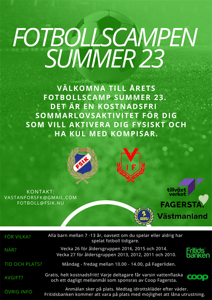 Välkomna till årets Fotbollscamp Summer 23! Det är en kostnadsfri sommarlovsaktivitet för dig som vill aktivera dig fysiskt och ha kul med kompisar. Fotbollscampen arrangeras av Fagersta Södra IK och Västanfors IF FK, och är helt gratis! Ingen föranmälan behövs. Mer info finns i bifogad bilaga. Vid frågor, kontakta: fotboll@fsik.nu P-12 12 jun 2023 0kommentarer