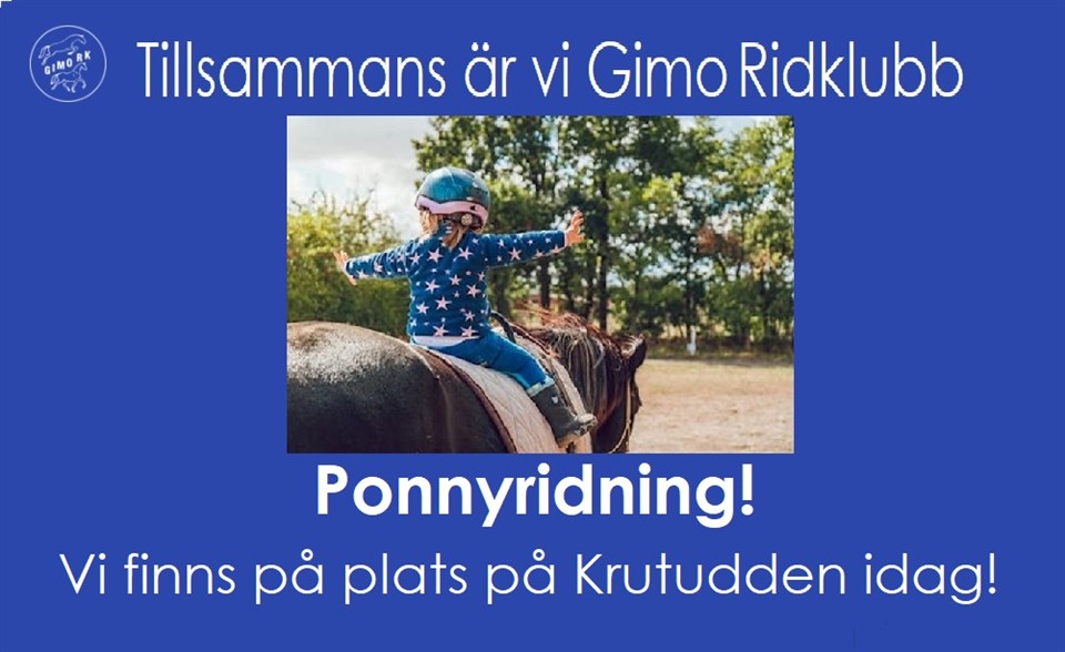 Idag är Gimo Ridklubb på Krutudden! Det är familjedag och alla aktiviteter är gratis. Vi är där med två av våra ponnier! Självklart är våra käpphästar med också. Kom och säg hej! Prata lite med oss och kanske ditt barn vill ta en tur? (Vi har dessutom ett fint erbjudande för alla nya och nygamla elever den här dagen) Läs mer om familjedagen här. Vi ses!