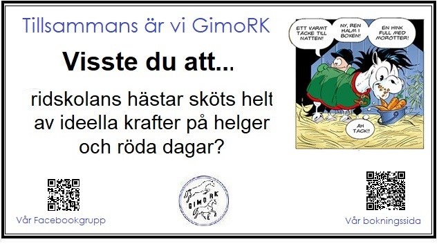 Ridskolans hästar sköts helt av ideella krafter på helgerna och röda dagar. Det är ett supermysigt sätt att umgås med våra hästar när det inte är ridskola Passa på att komma och träffa alla varma och trevliga stalltjänstare. Vi har möte nu på tisdag (5/9) kl. 18.30 i kafeterian (eller vid fint väder utanför stallet) Där kan du höra mer om ideella stalltjänsten och få reda på hur du kan ta del av vårt mycket förmånliga erbjudande* till de som är extra aktiva på stalltjänsten. Vad gör ideella stalltjänsten? Vi släpper ut hästarna / mockar / fixar med hö eller tar in hästarna på eftermiddagen på helgerna och på röda dagar. Vill du prova på? Du får självklart hjälp med sysslorna tills du känner dig trygg med uppgiften. Enda kravet vi har är att man är 18 år eller har med sig någon som är över 18 år. Och vi behöver bli fler. Vill du / ni bli en av oss? VI har alltså också fikamöten c:a 1 gång i månaden dit alla som vill får komma. Vi planerar inför kommande månaden, pratar tips och trix och småskvallrar i största vänlighet om våra härliga hästar. Till våra fikamöten är alla varmt välkomna, nyfikna som rutinerade! Vi brukar också anordna några tillfällen under året som är speciellt för er stalltjänstare. Det kan t.ex. vara en aktivitet, ett ridpass eller kurs som blir gratis för just för er. Om du inte kan komma på mötet på tisdag så löser vi det. Kontakta Sara med dina frågor och funderingar och hon hjälper dig till rätta med vem du kan prata med. Hon har dessutom stenkoll på rutinerna för alla pass och kan ge massa goa tips och råd. Sara nås på 076-0910999 Välkomna! /Anni, Sara & Jessika Tillsammans är vi Gimo Ridklubb *Vårt generösa erbjudande för dig som hjälper till mycket genererar en mycket trevlig rabattcheck att nyttja till t.ex. ridavgiften, ridkurser etc.