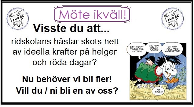 Ridskolans hästar sköts helt av ideella krafter på helgerna och röda dagar. Det är ett supermysigt sätt att umgås med våra hästar när det inte är ridskola. Vi behöver bli fler. Vill du / ni bli en av oss? Det vi gör på helgerna är att släppa ut hästarna / mockar / fixar med hö eller tar in hästarna på eftermiddagen Du får självklart hjälp med sysslorna tills du känner dig trygg med uppgiften. Enda kravet vi har är att man är 18 år eller har med sig någon som är över 18 år. Låter detta intressant? Passa på att komma och träffa alla varma och trevliga stalltjänstare. Vi har möte ikväll kl 18.30 i kafeterian (eller vid fint väder utanför stallet) Där kan du höra mer om ideella stalltjänsten och få reda på hur du kan ta del av vårt mycket förmånliga erbjudande* till de som är extra aktiva på stalltjänsten. Har ni några frågor eller funderingar eller vill ni hjälpa till kontakta Sara på 076-0910999 Hon har stenkoll på rutinerna för alla pass och kan ge tips och råd. VI har alltså också regelbundet fikamöten där vi pratar tips och trix. Om du inte kan idag så hör av dig. Vi kommer också ha ett nytt mote den 31/8 kl 18.30. Till våra fikamötena är alla är varmt välkomna, nyfikna som rutinerade! Välkomna! Tillsammans är vi Gimo Ridklubb *VI kan också fresta med att vi har ett finfint erbjudande för dig som vill hjälpa till mycket och få en mycket trevlig rabatt på ridavgiften.