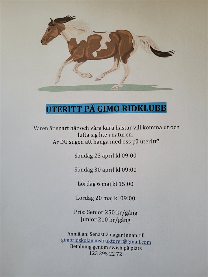 Nu är vi inne i maj månad och personalen börjar snart planera inför hösten. Som ridande behöver du tänka på ett par saker. För att vara garanterad din plats i höst betalar du en anmälningsavgift på 500:- senast 15/6. Denna anmälningsavgift kommer att räknas av från din lektionsfaktura. Anmälningsavgiften sätts in på bankgiro 200-8837. Märk insättningen med namnet på den ridelev som anmälan gäller. Behöver du byta dag/grupp så prata med din instruktör så försöker hon hjälpa dig tillrätta. Ridskolan startar igen på måndagen v. 33 Här hittar du all viktig information om vad som gäller hos oss inför höst-, och vårterminen 2023-2024 Vill du börja rida hos oss? Hör av dig till oss så hjälper vi dig tillrätta! gimoridskolan.instruktorer@gmail.com Vänliga hälsningar Ridlärarna och styrelsen