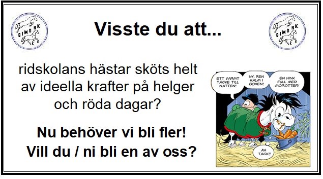 ..ridskolans hästar sköts helt av ideella krafter på helgerna och röda dagar? Nu behöver vi bli fler! Vill du / ni bli en av oss? Det vi gör på helgerna är att släppa ut hästarna / mockar / fixar med hö eller tar in hästarna på eftermiddagen Enda kravet vi har är att man är 18 år eller har med sig någon som är över 18 år. Låter detta intressant? Du får självklart hjälp med sysslorna tills du känner dig trygg med uppgiften. Har ni några frågor eller funderingar eller vill ni hjälpa till kontakta Sara på 076-0910999 Hon har stenkoll på rutinerna för alla pass och kan ge tips och råd. VI har också fikamöte på onsdag den 26/4 kl 18.30. Alla är varmt välkomna, nyfikna som rutinerade. Välkomna! VI BEHÖVER ER!