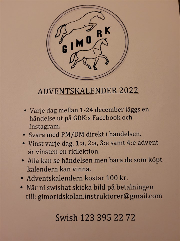 Nu har 2023-års almanacka har anlänt till stallet! Du som beställt den kan hämta den på vardagsförmiddagar mellan 07,00-11,00 eller ta i kontakt med instruktörerna och fråga om andra möjliga tider då personal finns på plats. Hör av dig till: gimoridskolan.instruktorer@gmail.com eller till GRKs Facebooksidas messenger. Vill du också ha vår supersnygga almanacka? Den innehåller underbara bilder på våra hästar som finns hos oss nu men också på hästar vi minns! Pris 199:- Så här köper du den: alt. 1: Kom förbi klubben och hämta. Det finns ett litet antal obokade kalendrar på klubben som säljs på plats, Betalning via Swish. Först till kvarn gäller alt. 2: Beställ och hämta senare: Maila gimoridskolan.instruktorer@gmail.com så meddelar vi så snart den finns att hämta. (Leverans senast vid terminstart i januari)
