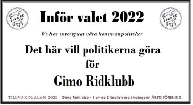 Inför valet – Vad tänker våra partier om ideella föreningar och Gimo Ridklubb? Inför valet 2022 passade vi på Gimo ridklubb på att fråga hur kommunens politiker ställer sig till vår klubbs hjärtefrågor. Vi bjöd in alla Östhammars kommuns partier att komma till oss för ett personligt möte på klubben med fika och rundvandring. Alla fick samma frågor utskickade till sig för att, i lugn och ro, kunna besvara dessa. De fem partier som redovisas i dokumentet är de som hunnit svarat på våra frågor. Vi hoppas på att få svar från resterande av kommunens partier senare. Några av partierna hann besöka oss på klubben nu innan valet och vi fick chansen att visa vår fina anläggning, Dessa möten blev mycket trevliga och intressanta! Två partier ville dessutom skänka en, av oss, uppskattad gåva till föreningen till stöttning i vår fortsatta verksamhet. Denna gåva var så klart inte förbunden med någon motprestation från vår sida gentemot partiet som skänkte gåvan – Tack Centerpartiet och Sverigedemokraterna. De partier som vi inte hunnit träffa nu innan valet hoppas vi få chansen att träffa senare i år. Klicka på länken och läs vad våra kommunpolitiker svarat på våra frågor. frågorna är uppställda på två överskådliga sätt, det ena med varje partis samlade svar och det andra i tabellform där man kan jämföra de olika partiernas svar på samma fråga. Trevlig läsning