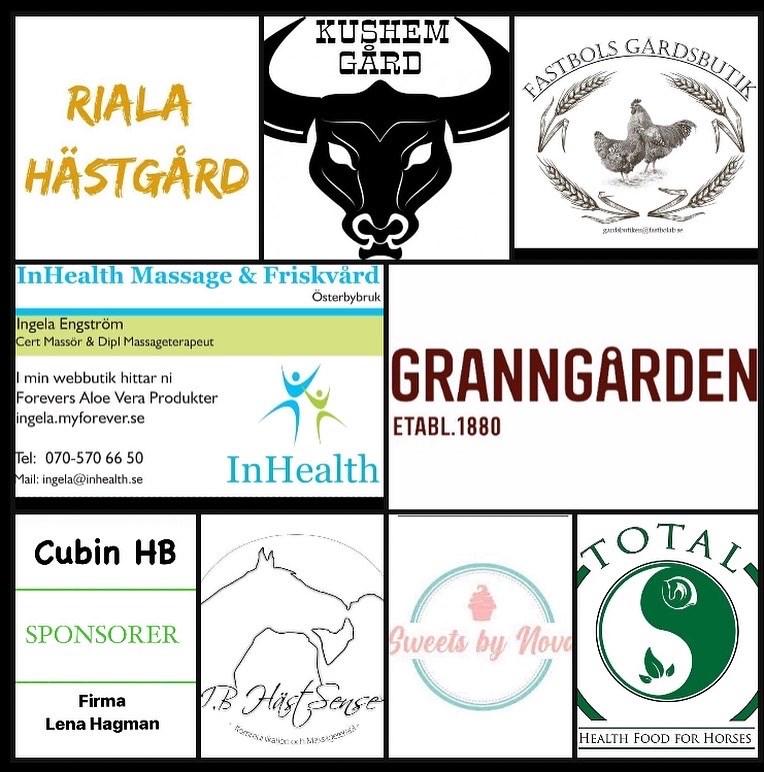 Stort tack till våra fantastiska sponsorer inför söndagens dressyrtävling på klubben! Wow vilka priser vi har. Lycka till alla deltagare. Vi ses på söndag! Sponsorer: Cubin HB Firma Lena Hagman Sandvik Riala hästgård Fastbol Gårdsbutik InHealth IB Häst sense Kushem Trail Sweetsbynova Total Horsefeed Granngården Hälsningar Gimo ridklubb Tävlingssektionen