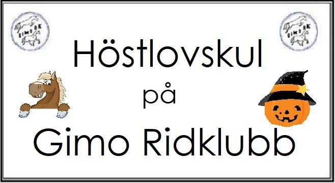 Gimo Ridklubb UngdomsSeKtion - GRUSK - vill härmed bjuda in dig till höstlovsläger med övernattning! Är du 6 år eller äldre och tycker det är kul med kompisar och hästar, då är detta lägret för just dig! Helgen vecka 43 – 26-27 oktober – sparkar vi igång höstlovet med ett läger. - lördag 14:30-19:00 - Söndag ca 9:00-14:30 Du som fyllt 10år är välkommen att sova kvar, Vi kommer att: - Sköta om hästarna. - Leka. - Tävla i bland annat käpphästhoppning. - Äta gott. - Prova på ridning. - Ha roligt. Vi som övernattar kommer också att gå en spökvandring och ha lördagsmys med film och spel. Godis tar du med själv, vi ordnar popcorn och läsk. Inbjudan gäller både dig som är medlem och dig som inte är medlem! Din anmälan görs på tavlan i stallet eller på mejl till gimoridklubb@outlook.com Vi behöver din anmälan senast den 24/10 Kostnaden är 200kr/deltagare