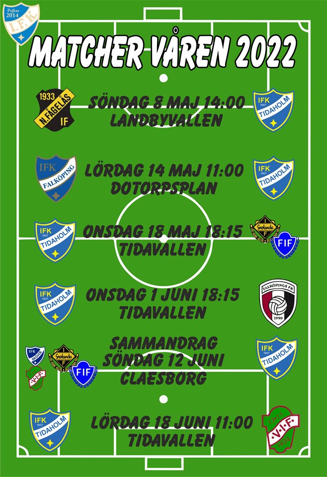 Efter en väl genomförd Giffcup, är det snart dags att focusera på matcher igen. Matcherna är lottade mot söndagar samtliga veckor, men vi har valt att spela två hemmamatcher på onsdagar för att få några långhelger och andra helger lite lediga och för att den 21:e maj är det klassbollen. Vi åker samtliga matcher med två stycken lag. Samlingstider för dessa matcher kommer det info om närmare matchdagen. Tid för sammandraget i Våmb får vi tider för senare. På onsdagsmatcherna utgår givetvis vår träning. Vi behåller de matchställena vi fått tillsvidare, och tvättar dem hemma. /Ledarna IFK P8