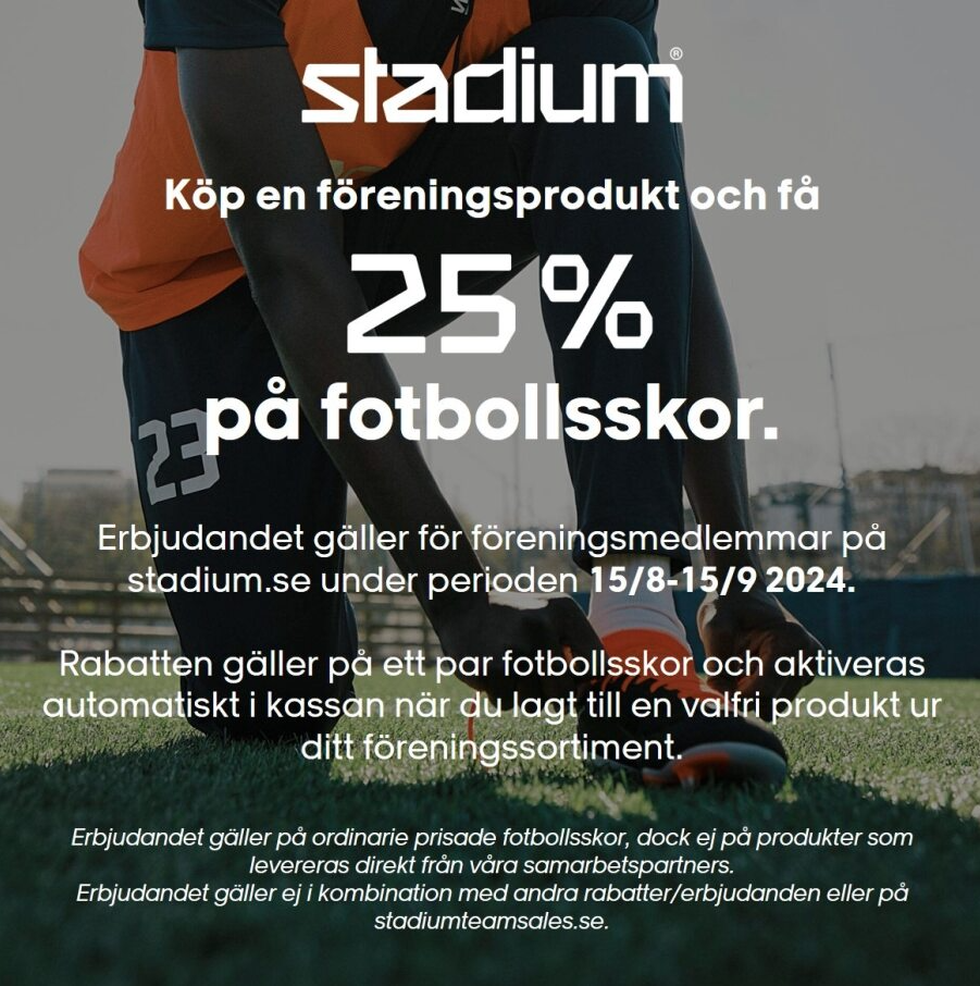 Fotboll Vi vill passa på att uppmärksamma er att 15 Augusti – 15 September har vi ett erbjudande aktivt för föreningsmedlemmar på Stadium.se! Erbjudandet aktiveras automatiskt i kassan på ett par fotbollsskor när medlemmen handlar en valfri produkt ur GAIS föreningssortiment. 25% rabatt på fotbollskor vid köp av en föreningsprodukt!* *Erbjudandet gäller på ordinarie priser, dock ej på produkter som levereras direkt från våra samarbetspartners. Erbjudandet gäller ej i kombination med andra rabatter/erbjudanden eller på stadiumteamsales.se https://www.stadium.se/teamsales (se hur man ger förerningen rabattt och leta sedan upp Gränna AIS bland föreningar i menyraden upptill)