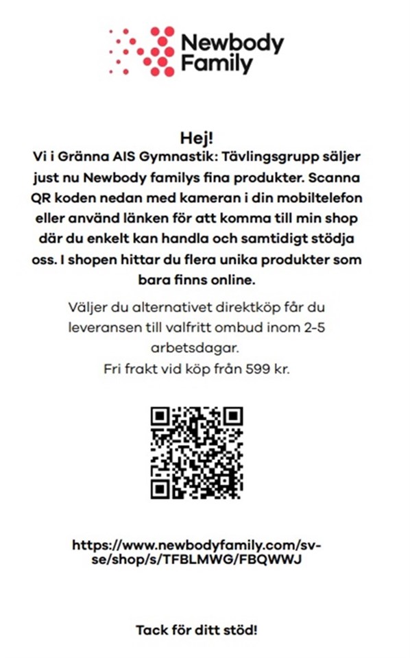 Var med och stötta Gymnastikens tävlingsgrupp genom att beställa från New Body. Se bild och följ instruktioner eller scanna QR-koden eller klistra in följande länk i din webläsare: https://www.newbodyfamily.com/sv-se/shop/s/TFBLMWG/FBQWWJ?ut=1_206 Gränna AIS 14 feb 2024 0kommentarer