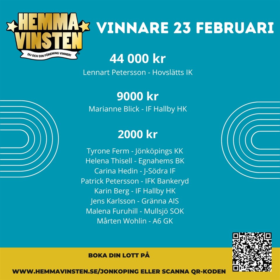 Efter ändrade vinstutbetalningar på Hemmavinsten finns det nu fler kontantvinster som delas ut. Emil Hagbardsson är vår första vinnare av en sådan kontantvinst - Grattis Emil! Boka en lott du också, du kan vara nästa vinnare och Gränna AIS får klubbvinsten. Länk till Hemmavinsten här - där du kan boka din lott och få mer information om lotteriet: Gränna AIS 12 jan 2024 3kommentarer