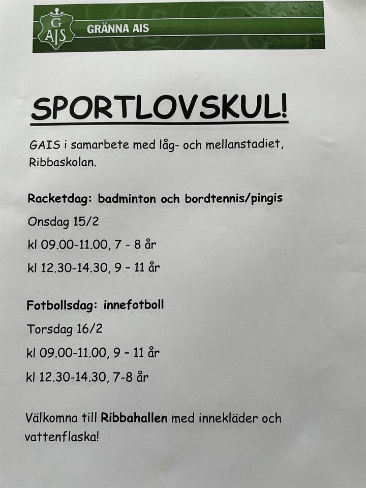 Tur att vi har en så fin sporthall när sportlovet inte erbjuder snö och is i Gränna! I dagarna två har GAIS och Ribbaskolans fritidshem erbjudet ungdomarna racketsport samt innebandy och fotboll! Vår lokala ICA affär har bjudet barnen på frukt och dryck! Stort tack till ICA för det! Samarbetet mellan GAIS, Ribbaskolan och ICA fortsätter på övriga lov framöver och vi tacka fritidspersonalen samt ledarna från GAIS för detta! På bilden ser vi Jennifer från Ribbaskolans låg och mellanstadie samt Hedda fotbollsledare från GAIS! Stort tack till Robert, Julia, Johan, Karin och ni andra för ert arbete med detta!