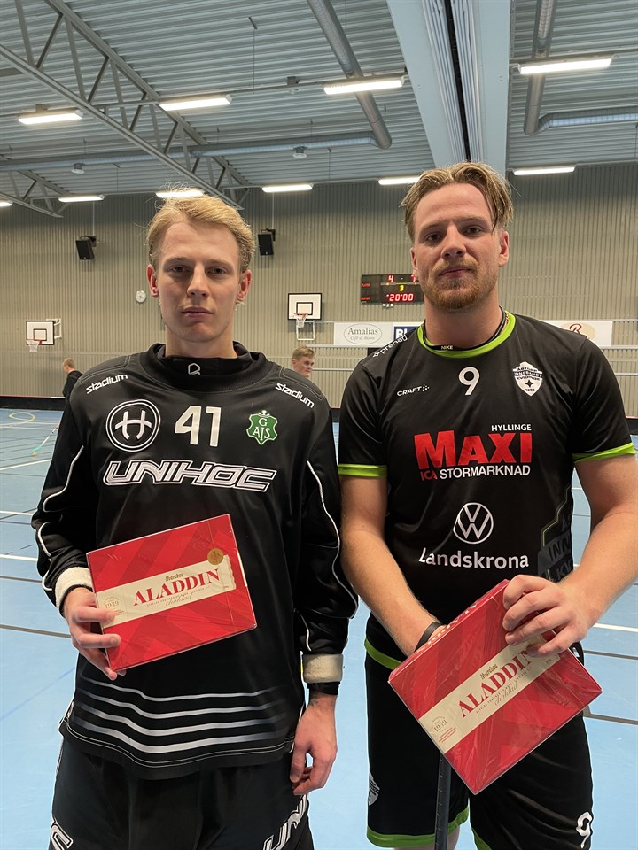 Det blev en mycket spännande innebandymatch i Polkaborgen (Ribbahallen) mellan Gränna AIS och Åstorp/Kvidinge (Helsingborg)! GAIS inledde bäst och efter 1-0 i första ökade man till 2-0 i början av andra ett resultat som höll fram till en olycklig utvisning för fördröjande spel i slutet av perioden. Då kom 2-1 och innan perioden var slut även 2-2, när endast sekunder återstod. Tredje perioden startade med att GAIS återtog ledningen genom Emil Skog som sedan kunde utökats när Skåningarna fick en utvisning. Då händer det som inte får hända att man släpper in 3-3 målet med en man mer på banan. Sedan får gästerna utvisning och då tänker man att vi ska gör mål med en man kort men det blev tvärtom mål igen för gästerna. Ytterligare mål för skånelaget när fyra minuter återstår och i den sista minuten när vi taget ut målvakten ytterligare två mål i baken samt att vi fick ett reduserings mål åter då genom Emil Skog. Matchen slutade med vinst för gästerna med 7-4 och bästa spelare i vardera lag blev som vi kan se på bilden för GAIS målvakten Lucas Hallgren. Sällan har vi sett en bättre målvakt som storspelade under hela matchen med fantastiska räddningar. Tack för uppvisningen Lucas! Priset till gästerna gick till Jonathan Rosengren. Tilläggas kan att Åstorp/Kvidinge spelade i Allsvenskan och vi gick från div 2 från förra spelåret. Bra spelat grabbar, ni kommer snart att föra matcherna hela tiden! 👍