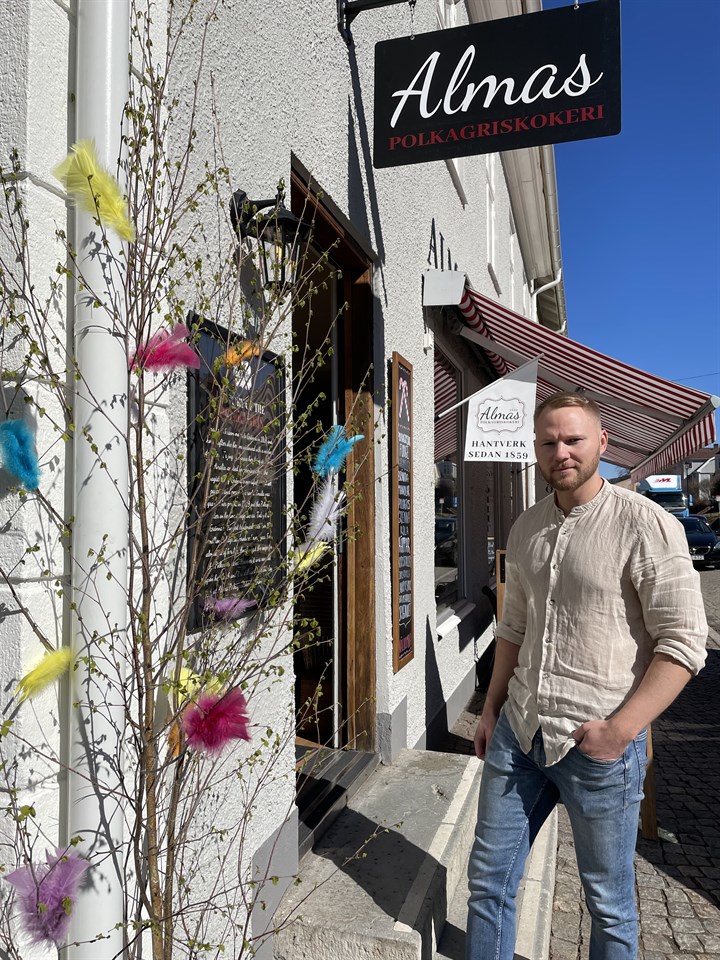 Kim Lindkvist ägare till Almas är en av de många butikerna på Brahegatan som satsade på GAIS påskbjörkar! Tack alla ni som valde att dekorera med påskdekoration från Gränna AIS! Visst blev det fint i solljuset!