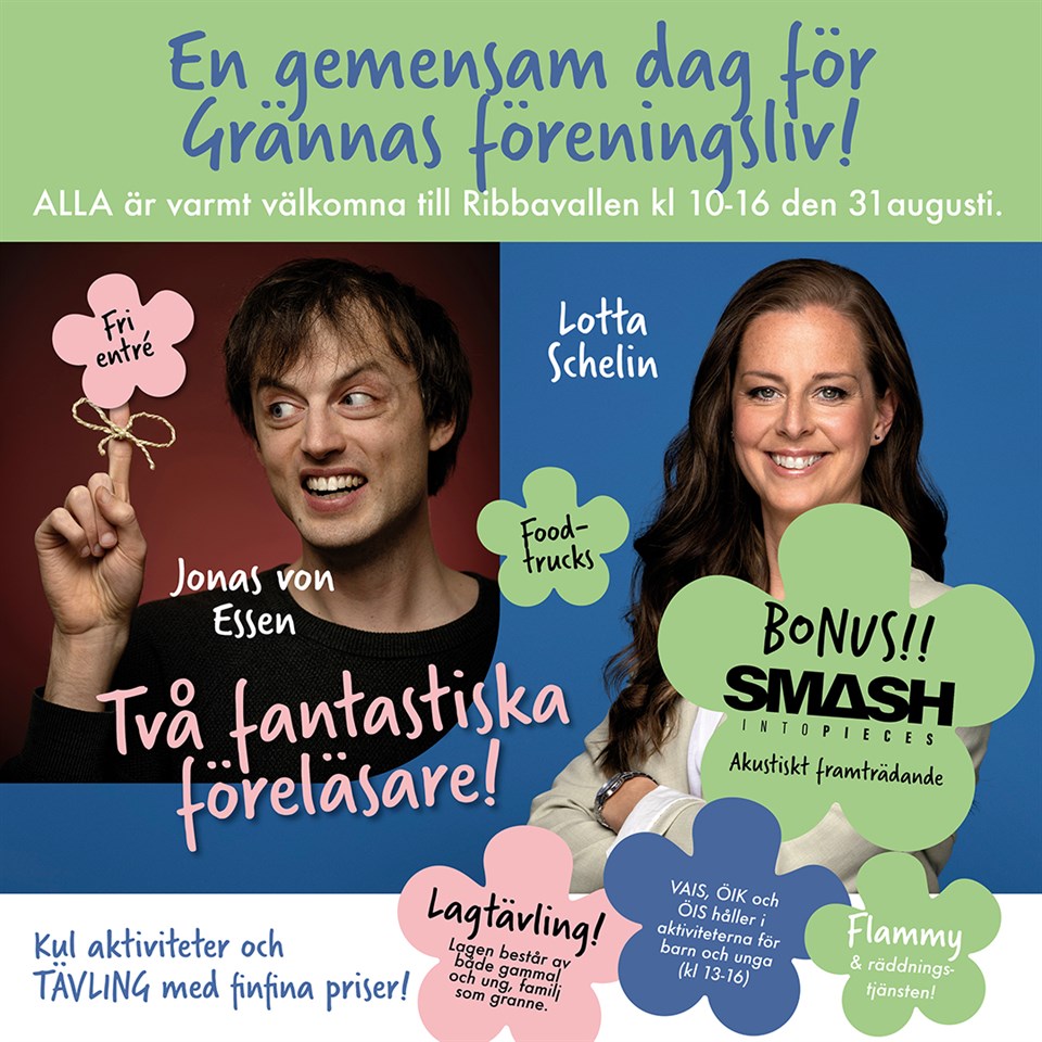 Bygdepengen bjöd på "En gemensam dag för Grännas föreningsliv!" Allt på vår fina idrottsanläggning Ribbavallen! Jonas von Essen, Lotta Schelin och Smash into Pieces var dragplåster och Petra skötte Soff-intervjuerna med den äran. Habo Volley, IK Tord, våra idrott och kultur politiker, RF sisu, ja alla fick sitta i soffan även Claes Stråth och chefen för vindkraftverken. Alla föreningar visade upp sig och polis, räddningstjänst, maskoten Polka Valle ja alla var på plats! Ballongklubben, båtklubben, golfklubben, Scouterna, GBOK med cykelgänget, Ridklubben, Inger och Kulturgården, VAIS, ÖIK, ÖIS och givetvis GAIS med Nicke, Siw, Niklas, Hanna, Henrik och alla idrottsmixarna. Tack ni som ordnade detta. Har jag glömt någon eller något ber jag om ursäkt. Jo visst ja Johanna!!! Tack för en jättefin dag!👍👍👍