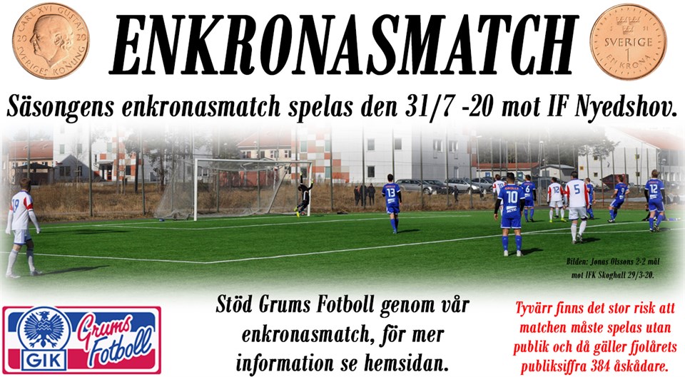 Under coronakrisen har det slagit hårt på många delar av Sverige och världen, även för oss alla inom idrotten. Fredagen den 31/7 kommer Grums Fotboll arrangera en enkronasmatch på alagsmatchen mot IF Nyedshov där privatpersoner och företag betalar X kronor/åskådare. Eftersom det inte får vara någon publik på våra matcher så är det bestämt att publiksiffran från fjolårets enkronasmatch på 384 åskådare gäller. Styrelsen i Grums Fotboll har beslutat att för varje ”enkrona” ungdomslagen drar in så går 30 öre till sitt lags lagkassa. Viktigt att när ni redovisar tydligt talar om vilket lag som det kommer ifrån. Det finns även möjlighet att lämna valfri summa till matchen, då är det 30% även på den summan. Blanketter för enkronasmatchen kommer inom snar framtid att finnas på Grönberg samt finns länken nedan. https://www.laget.se/GrumsIKFK/Document/Download/-1/8967541 Räkneexempel: En enkrona på den matchen är värd 384:-, varav 30% går direkt till lagkassan, som är 115,20:- En person/företag skänker 500:- i fast belopp går 30% direkt till lagkassan, som är 150:- Mer information kontakta mig Fredrik Nilsson 070-547 30 33 fredrik.nilsson@billerudkorsnas.com Team-2009 3 jul 2020 0kommentarer